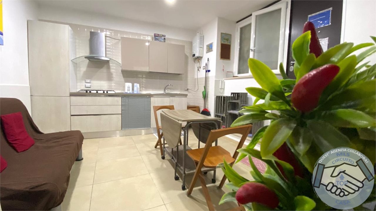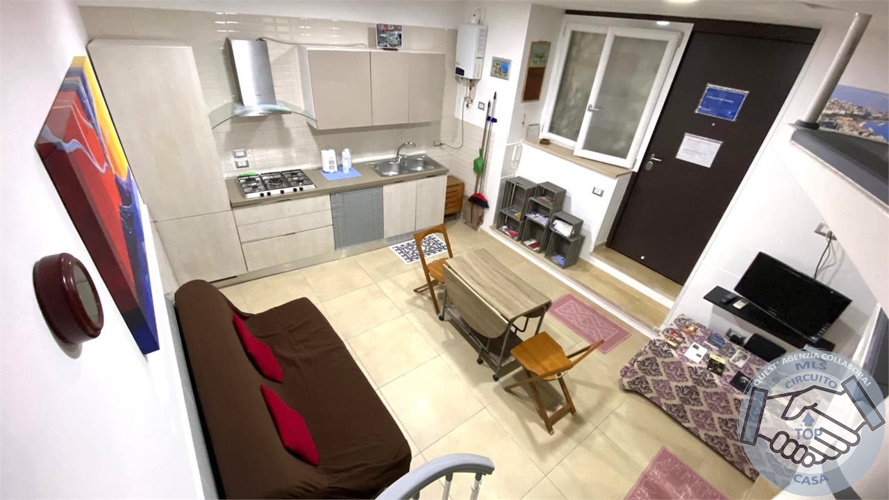 Ingresso in zona giorno living con angolo cottura attrezzato.